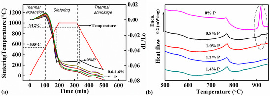 Figure 4a shows the DIL curves of samples with different P contents (0, 0.6, 0.8, 1.0, 1.2, 1.4 and 1.6 wt.%). All the samples showed expansion when they were heated from RT (room temperature) to ~535 °C. The expansion rates in this stage varied from 0.96 × 10−5 to 1.79 × 10−5 K−1, which were caused by thermal expansion of the samples. The samples started to be sintered when the sintering temperature was higher than 550 °C. The thermal expansion was offset by the shrinkage caused by sintering, therefore the expansion slowed down and finally changed to shrinkage.
