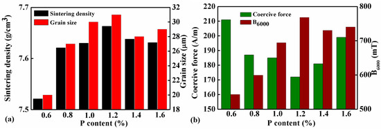 (a) Sintering densities and grain sizes, (b) coercive force and magnetic induction under 6000 A/m (B6000) of samples with different P contents sintered at 1000 °C for 2 h.