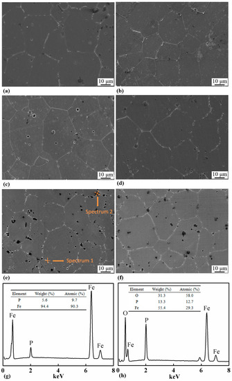 The SEM micrographs of the samples with 0.8, 1.0, 1.2, and 1.4 wt.% of P, which were sintered at 1000 °C for 2 h, are shown in Figure 6. All the samples had equiaxial grains with white precipitates distributed along the grain boundaries. The grain sizes were measured and the results are listed in Table 3 and shown in Figure 5a as well. Increase in P content had little effect on the grain size of the sintered samples. In the samples with 1.2 and 1.4 wt.% of P, black particles with a size of several microns were formed, which were found either along the grain boundaries or inside the grains. EDS was carried out on the grain boundary precipitates and the black particles. The results are shown in Figure 6g,h, and suggest that the grain boundary precipitates only contain Fe and P, while the black particles are a kind of complex oxides of Fe and P.