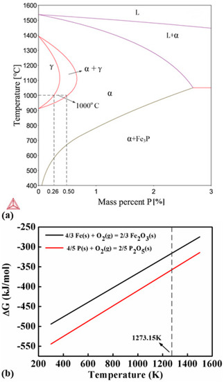 (a) Fe-P binary phase diagram showing that the ferrite can be stabilized by P addition and (b) Gibbs free energies ΔG of the oxidation reactions of Fe and P suggesting that P is more prone to oxidization than Fe at the sintering temperature.