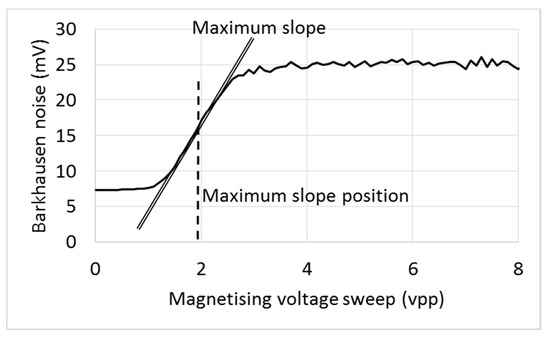 A so-called BN sweep measurement can be used in the evaluation of case depth for nitrided samples [10]. The measurement is based on the voltage sweep carried out prior to the actual BN measurement to determine a suitable magnetisation voltage. Figure 1 shows an example of a voltage sweep. In a prior study [10], it was found that the sweep holds information relevant for evaluating case depth. That information can be revealed by finding the maximum slope of the sweep and the corresponding voltage (slope position), as shown in Figure 1. When these values are determined from sweeps carried out with low (20 Hz) and high (125 Hz) magnetisation frequencies, the ratio of slopes has a linear relationship with case depth [10]. The slope positions have also been noticed to hold information about the residual stress state of the material [11]. Even though a linear relationship was observed in [10], the authors also noticed that the relationship depended on surface hardness.