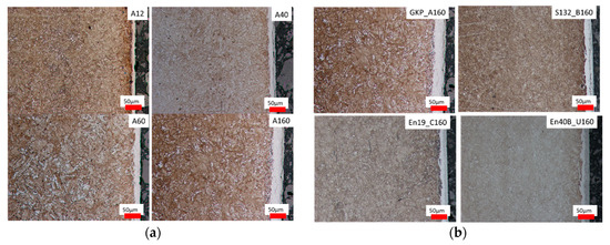 (a): Optical micrographs of GKP samples A12, A40, A60, and A180. The white layer thicknesses were 14, 20, 21, and 36 µm, respectively. (b): Optical micrographs with constant nitriding time of 160 h of samples GKP, S132, En19, and En40B. The white layer thicknesses were 36, 24, 21, and 32 µm, respectively.