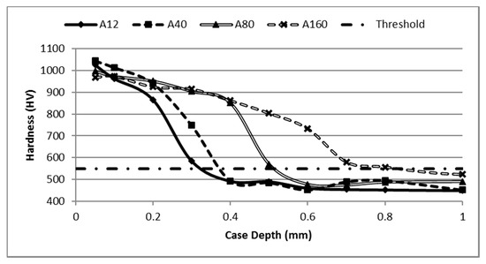 The BN sweep measurements were also carried out with the Rollscan 300 device (Stresstech Oy, Vaajakoski, Finland) using Stresstech PCCaseDepth software for computing. The magnetising voltage was increased with 0.1 Vpp increments from 0 to 16 Vpp. The sweeps were recorded with magnetising frequencies of 20 and 125 Hz. Surface hardness values were measured with Matsuzawa NMT-X7 (Matsuzawa Co. LTD, Akita, Japan) hardness tester with the applied load for these Vickers hardness measurements of 1 kg. Hardness depth profiles were measured using a Buehler MMT-7 micro-hardness tester (Buehler, Lake Bluff, IL, USA) with a load of 300 g. The optical micrographs were taken with Nikon DS-L2 optical microscope (Nikon, Tokio, Japan).
