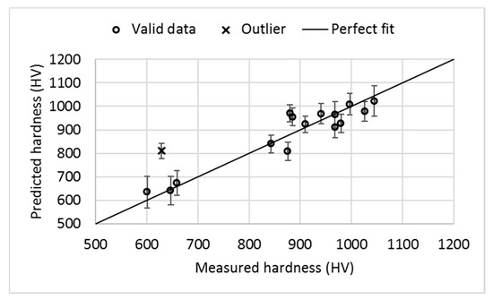 The results obtained with the ground sample data set are very similar to those obtained with the non-ground data set. The same terms were eliminated from the model, and one outlier was detected. The R2 value of the obtained model is 0.92 and the RMSE value is 43.7 HV. Table 5 gives the values of the regression coefficients together with their standard errors, p-values, and contributions. Figure 6 shows the graph of predicted vs. measured hardness. Low standard errors and significant contributions shown in Table 5 indicate that the terms in the model are valid.