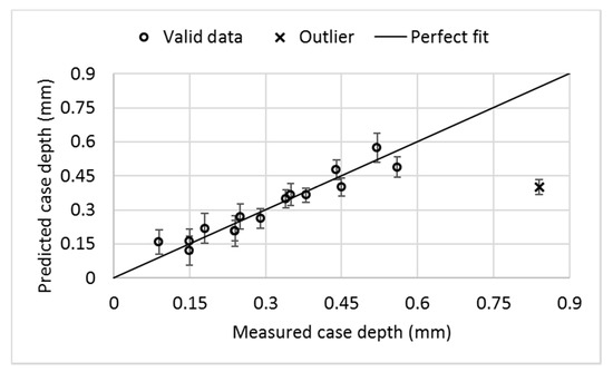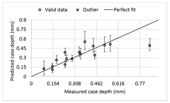 Predicted vs. measured case depth with the non-ground sample data set. The predictions are obtained from the model of the logarithm of case depth.