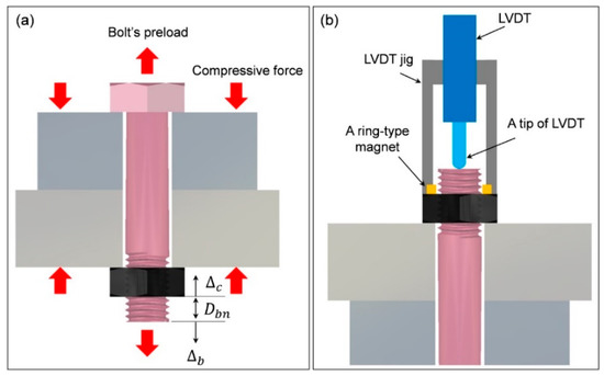A typical bolted joint is shown in Figure 1a. If torque is exerted to a bolt, the bolt experiences an elongation and thus a preload (Fp), while the clamped parts are compressed. At the same time, distance between the end surfaces of both the bolt and nut, Dbn, is varied. It should be noted that Dbn depends on the axial displacements of bolt and clamped parts, Δb and Δc. Under the assumption that all parts are appropriately snugged, Δb and Δc are determined in terms of the stiffness and the preload as shown in the following equations [28].