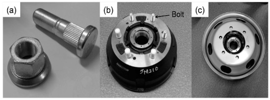 For experiments and computational analyses, all the parts of a truck wheel were prepared. Figure 2a shows a hub bolt (M18, strength grade 10.9) with a fine pitch (1.5 mm) and a wheel nut, which are based on the specifications of the international organization for standardization (ISO) [29]. A hub assembly and a wheel were shown in Figure 2b,c, respectively. A total of six hub bolts with serrations in their shanks were press-fitted to the hub assembly, so the bolts did not move during fastening. The hub assembly was then fastened to the wheel using six wheel nuts. Detailed specifications of the bolt used in this study are listed in Table 1. Note that the nominal tensile yield force, FY, under pure tension is as high as 203 kN.