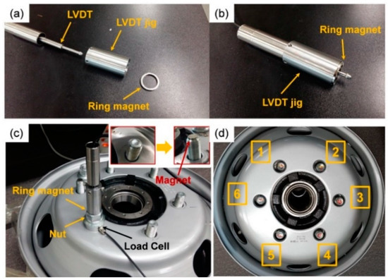 A total of six identical bolts were connected to the hub assembly, and each bolt was numbered from one to six for the convenience of experiments (Figure 3d). In order to directly measure the actual preload of a bolt, a washer-type load cell (1-KMR/300 kN, HBM Co., Darmstadt, Germany) was placed between the clamped part and nut as shown in Figure 3c. The preload measured by the load cell was correlated with Dbn measured by the L-PMS.