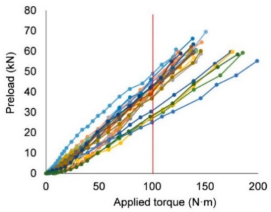 For the bolt tightening over the yield point, the torque plus angle-control method can be adopted, in which a low torque is first exerted for snugging followed by turn of angle up to a prescribed value. Its variation of preload mainly depends on the variation of bolt’s yield strength, so this method has a lesser preload variation than either torque control method or angle control method [11]. Tightening over the yield point can increase the resistance of self-loosening and fatigue failures by applying a sufficient preload to the bolt; however, the risk of bolt rupture during tightening exists due to over-tightening [12,13]. Another alternative is the torque-gradient method where torque, angle, and their gradient are continuously monitored. The tightening process is completed by considering all the three values, especially the gradient. However, this method requires an expensive tool system as well as a longer process time, and there is also the possibility of the risk of over-tightening [12,14].