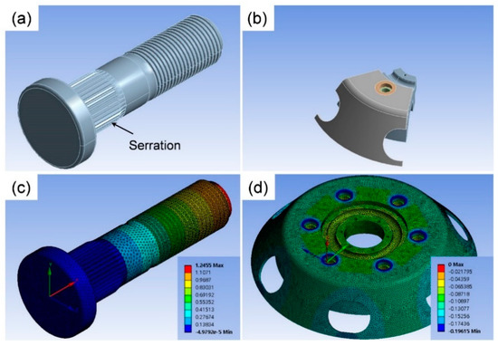 As emphasized in Equation (3), the stiffness determined by materials and structure is a key factor for the sensitivity of L-PMS, which means that the sensitivity of L-PMS is different depending on a bolt and joint structure used. It is inefficient to find the sensitivity of many different types of bolts and joints only through an experiment in terms of time, cost and applicability. In previous studies, it has been demonstrated that FEA can be used to predict the stiffness of bolt and joint structure directly from the joint geometry and material properties, and the predicted value of stiffness using FEA shows a good agreement with the actual stiffness [32,33]. Thus, FEA was performed using a commercial FE software ANSYS to predict the stiffness of both the bolt and clamped parts. Analysis models of the bolt and the clamped parts are shown in Figure 8a,b, respectively. Since the bolt and clamped parts were fabricated from structural steel, they were modeled using an isotropic material with the elastic modulus of 205 GPa [34]. For the bolt model, a tetrahedral volume mesh was generated, and the number of elements was 154,247. The head region (serration region) was fixed because the bolt was embedded in a hub assembly via press fitting. An axial tensile force of 1 kN was applied on the end surface of bolt in the normal direction so that the bolt experiences pure tension. For the clamped part model, a one-sixth portion was analyzed due to its cyclic symmetry nature, and the number of elements was 153,200. The axial compressive force of 1 kN was applied on the nut bearing surface in the normal direction, while the bolt head bearing surface was fixed. All contact regions between the wheel and hub assembly were assumed to be bonded because friction between wheel and hub has little effect on the stiffness in pure compression state [35,36].