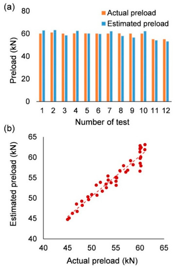 A total of 12 tests were conducted and compared with the actual preloads independently measured by the washer-type load cell. Figure 11a shows the comparison between the estimated and actual preloads. In the first test, for example, the measured Dbn was 31.34 μm, so FP was estimated to 62.86 kN. On the other hand, the actual preload was measured to 60.04 kN. Compared to the actual preload, the estimated preload showed a 4.6% error. In this manner, all the test results were compared with the actual preloads. The error was found to be within ±6%, which is indeed comparable to other monitoring methods [7,40]. Finally, the relationship between the estimated and actual preloads is presented in the range of ~45 kN to ~60 kN in Figure 11b. The results showed a good linear agreement between the two values.
