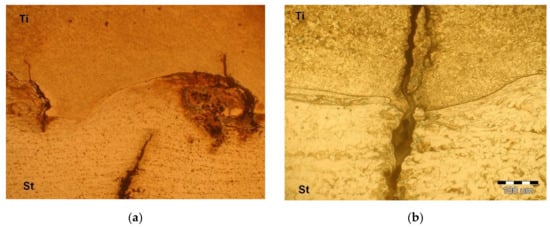 - Gloc, M.; Wachowski, M.; Plocinski, T.; Kurzydlowski, K.J. Microstructural and microanalysis investigations of bond titanium grade1/low alloy steel st52-3N obtained by explosive welding. J. Alloys Compd. 2016, 671, 446–451. [Google Scholar] [CrossRef]