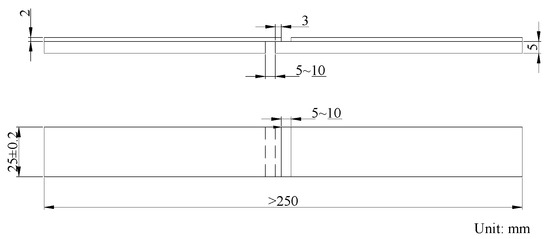 Measurements on the microhardness of the parent materials close to the welding interface were carried out by Huayin HV-1000A vickers hardness instrument (Huayin test instrument Co. LTD, Wuhan, China) with 300 g load for 10 s. At the same time, the tension-shear tests were conducted using a GB/T 6396-2008 materials test system. The dimensions of the tensile specimen are shown in Figure 4, and the samples were cut along with the detonation direction.
