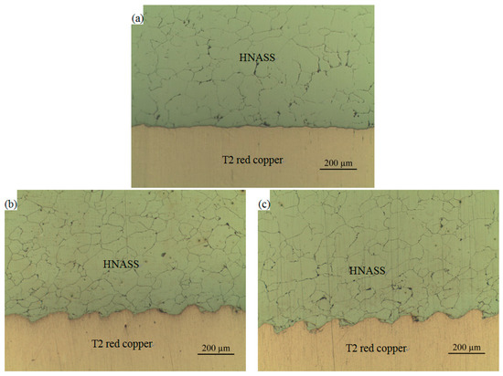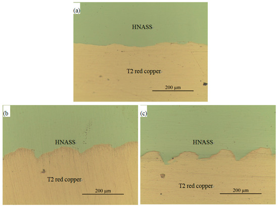 The morphologies of the bonding interface using different welding parameters are shown in Figure 5. It can be observed that the bonding interface is different for different parameters. As can be seen from Figure 5a, a relative flat joint interface without obvious regular oscillations can be observed in TH-2. The morphology of the interface is similar to that of Al/Cu composite as indicated by Loureiro, et al. [20]. However, the joint surface presents a regular wave bonding pattern in TH-3 (see Figure 5b) and the wavelength is about 200 μm. The wavelength and the amplitude of the bonding interface gradually increase with increasing ratio of the explosive. For TH-4 (see Figure 5c), the wavelength of the bonding interface is about 150 μm. Nevertheless, several copper melts and thin HNASS strips penetrated into the T2 red copper plate at the joint interface.