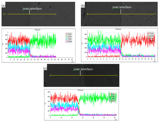Element line scanning near the joint surface under different explosive welding conditions. (a) R=0.9; (b) R=1.1; (c) R=1.6.