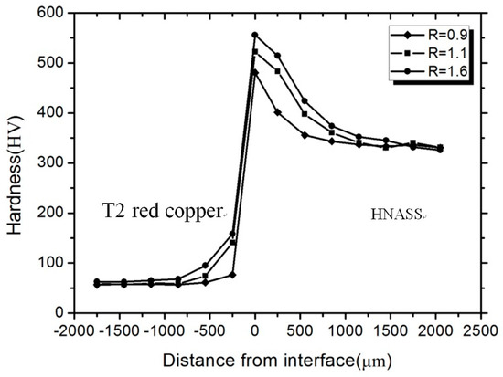 The measured results of the microhardness for different explosive welding parameters are shown in Figure 8. It can be observed that the microhardness value at the joint surface of the sample after explosive welding is the highest. On each side of the bonding interface, the microhardness value decreases gradually and then becomes stable as the distance from the bonding interface increases. This is mainly because of the plastic deformation near the joint interface which occurs when two plates collide with each other at high speed during explosive welding. The plastic deformation causes strain hardening of the material, which improves the hardness of the material; the closer to the joint interface, the more serious the plastic deformation. When the distance from the interface exceeds a certain distance, no plastic deformation occurs. This phenomenon is consistent with the previous research demonstrated by Kacar and Acarer [21]. By comparing the microhardness values under different welding conditions, the larger the explosive ratio, the higher the microhardness value at the joint interface, indicating the greater the degree of hardening at both sides of the joint surface. This is mainly because that the larger the explosive ratio, the higher the collision speed of two plates, which leading to greater impact pressure and plastic deformation during the collision process. As already mentioned, there is plastic deformation near the interface. The microhardness value increases with the increase of plastic deformation degree.