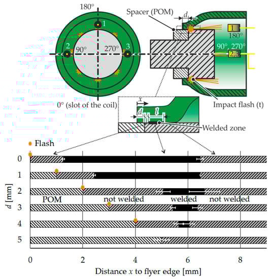 - Bellmann, J.; Beyer, E.; Lueg-Althoff, J.; Gies, S.; Tekkaya, A.E.; Schettler, S.; Schulze, S. Targeted Weld Seam Formation and Energy Reduction at Magnetic Pulse Welding (MPW). eBIS 2017, 2017, 91–102. [Google Scholar] [CrossRef]