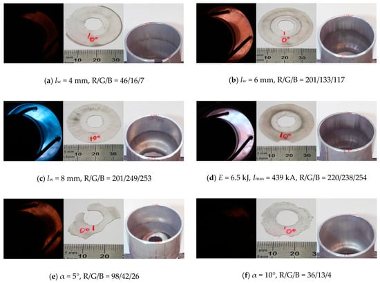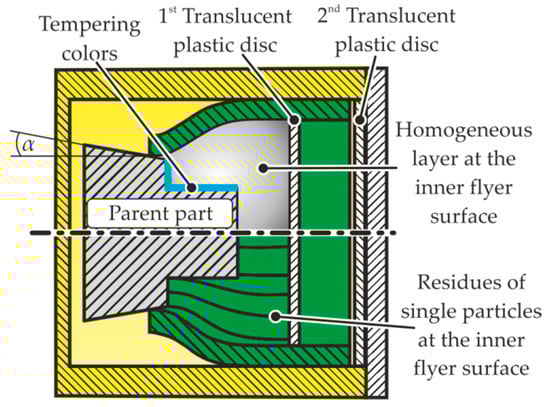 - For small collision angles, the level of compression and the internal friction of the CoP are higher and, thus, the temperature in the joining gap increases. In this configuration, the CoP is finely distributed like a metal vapor, which activates the surfaces of the joining partners homogeneously and can be seen inside the flyer tube after the experiment. If the collision angle is increased, the temperature decreases and single macroscopic particles are ejected. These particles seem to have a reduced surface activation effect, compared to the finely dispersed metal vapor described previously and thus, inhibit welding.