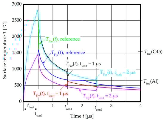 - The numerical simulations of the surface temperatures of both joining partners revealed a strong influence of the waiting time between the end of the heat input by the CoP and the contact of both joining partners. Especially for dissimilar metal welding, this time needs to be very low to avoid solidification before the contact. This finding is important for the theory of liquid state bonding and in good correlation with the experimental results. Small collision angles, or gap closing times, respectively, are beneficial for the weld formation during MPW.