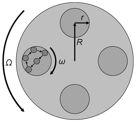To compute the milling energy, the paths of the grinding spheres have to be estimated and exemplified. Owing to the inverse revolution of the supporting plate and the milling vials, the spheres are presumed to be touching the walls along the half circumference of the internal vial wall and then escape centrifugally to the opposite side of the circle (Figure 1). Agreeing to this hypothetical path, the energy transfer to the powder in the course of the grinding process is calculated using an adapted model, from the original of Burgio et al. []. This model accepts that the spheres inside the milling vial neither slide nor roll along the half circumference of the internal wall. The mathematic model is established on the kinetic energy ΔE of one ball in the moment of the collision on the wall on the other side of the milling vial: