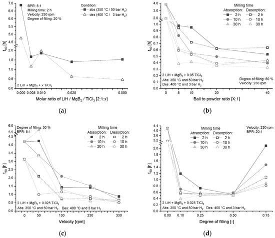 Kinetic behavior, expressed by means of t80, as function of (a) additive content, (b) BPR, (c) milling velocity, and (d) degree of filling. All sets are for absorption and desorption, and display different milling times.