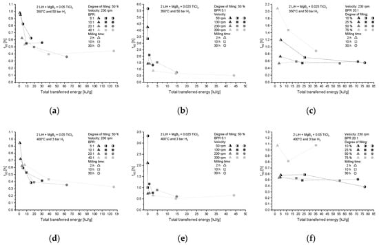 Figure 6 shows a summary of the effects of different milling parameters on the reversible hydrogen capacity (second cycle). The H2 capacity is displayed in correlation with the energy transfer, in agreement with the parameters from Equation (4), for several BPR (Figure 6a), velocities (Figure 6b) and degrees of filling (Figure 6c).