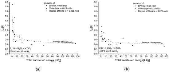 As a further amendment, the result at 50 rpm in Figure 4b and e are ignored due to the low transferred energy (0.010 to 0.157 kJ g−1) in contrast to the other resulting energies transfer. The difference of the t80 levels at 50 rpm is just considered as a statistical variation. The results for 50 rpm of velocity and 75% of filling are therefore ignored in the next lines. The results for both hydrogenation and dehydrogenation are summarized in Figure 5a,b, respectively.