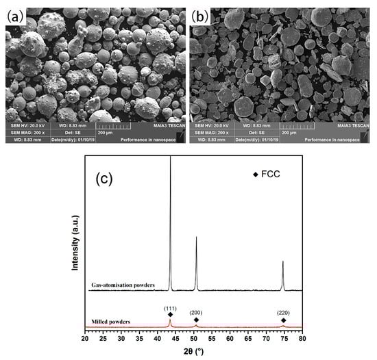 Microstructure of FeCoCrNiMo high-entropy alloy (HEA) powders before (a) and after (b) ball milling, (c) X-ray diffractometer (XRD) pattern of two powders. FCC—face-centered cubic.