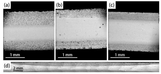 Longitudinal cross-sections of the same area in the FeCoCrNiMo HEA samples sintered at 1150 °C under different pressures: (a) 30, (b) 35, and (c) 40 MPa, as well as (d) the macrostructure of the 30 MPa sintered sample.