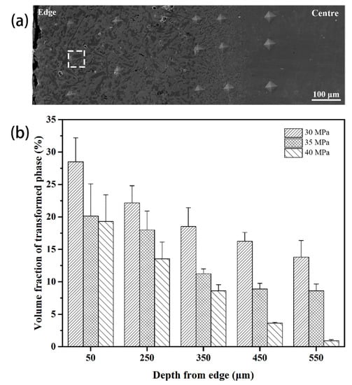 Under the sintering pressure of 30 MPa, the microstructure exhibited a distinct gradient distribution, as illustrated in Figure 3. It can be seen that multiple phase structures were successfully synthesized during SPS. The volume fraction of the transformed phase increased gradually from the center to edge of the specimen. As shown in Figure 3b, the volume fraction of the transformed phase decreased as the depth increased, which shows that sintering pressure directly affects the degree of phase transformation and presents a gradient distribution. For example, when the sintering pressure is 30 MPa, the volume fraction of the transformed phase is reduced from about 27% at the edge to 14% at a depth of 550 microns, and the volume fraction is reduced by half. When the sintering pressure is 40 MPa, the volume fraction of the transformed phase is sharply reduced from about 19% at the edge to 1% at a depth of 550 μm, which is about 20 times lower. It can be seen that the sintering pressure has a significant influence on the transformed phase volume fraction and the distribution of the transformed phase along the thickness direction. By controlling the sintering pressure, the gradient distribution of the multiple phase along the pressure direction can be realized and regulated.