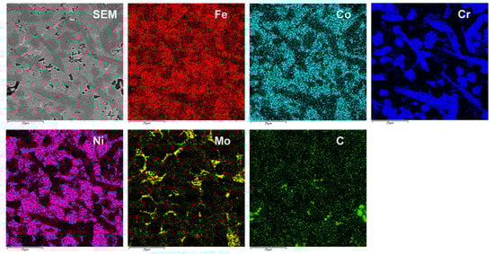 SEM image and EDX maps of Fe, Co, Cr, Ni, Mo, and C of marked area in Figure 3a of HEA after spark plasma sintering (SPS) at 1150 °C and 30 MPa.