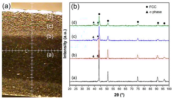 Figure 2a–c shows the longitudinal cross-sections of the HEAs samples sintered at 1150 °C under different pressures. Judging from the contrast images, the microstructure did not consist of a single phase, as did those obtained after lower temperature sintering in our previous study [].