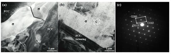 According to the (CoFeNi)–Cr–Mo pseudo ternary phase diagram at 900 °C and the (CoFeCrNi)–Mo pseudo-binary phase diagram in the work of [], the microstructures of the dual phase (FCC and σ phase) structure (marked area in Figure 3) are examined and presented in Figure 6. The P1 area exhibits a single-phase polycrystalline structure, which can be identified in Figure 3. With the proceeding to the center of the specimen, the microstructures evolve to a dendritic structure, and Mo starts to segregate in the interdendritic areas and gradually shows a mixed two-phase structure. The TEM images and the selected-area diffraction (SAED) pattern in Figure 6a,c, showing a large precipitate embodied in the FCC matrix, clearly confirm that the precipitate consists of a mixture of the FCC and the σ phase, which are enriched with Cr and Mo elements (Table 1). It is noted that the FCC phase particles were precipitated out from the σ phase particle during cooling from a high temperature by solid-phase transformation. Thus, this complex structure can be simply referred to as a “double precipitation” during cooling, which can be explained by the pseudo binary diagram.