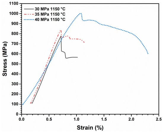 Figure 8 shows the bending curve of the HEA sample SPS processed under different pressures. According to Figure 8, when the sintering pressure is 40 MPa, the sample has the highest transverse strength of 1004 MPa and the highest fracture strain of 2.3%. With the decrease of sintering pressure, the strength and strain also decrease. When the sintering pressure is 30 MPa, the bending strength is 779 MPa. Obviously, the transverse strength decreases with the increase of the volume fraction of the σ phase. This is because the σ phase is an intermetallic compound with intrinsic brittleness. In contrast, the FCC phase has higher toughness. Comprehensively, when the volume fraction of the σ phase is small, the transverse strength of the FCC phase is more reflected. When sintering pressure is 30 MPa, the σ phase increases significantly, which leads to the decrease of transverse strength.