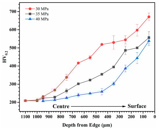 The sample exhibited a gradual microhardness change similar to the gradually distribution of the σ phase. The center of all the three specimens consisted of a single FCC phases structure with a constant microhardness value of approximately 210 HV0.2. As an increasing amount of the new structure precipitated, the hardness gradually increased as the distance from the surface decreased, and the hardness increased to the maximum value at 50 μm from the surface, as shown in Figure 9. The highest hardness could be attributed to the effect of the large volume fraction of hard σ phases. It also illustrates that the sintering pressure directly affects the gradient distribution of the FCC to σ phase transformation in the thickness direction. When the sintering pressure is 30 MPa, the hardness distribution shows a steep trend owing to the transformation of the FCC phase to the σ phase. However, at 40 MPa, the overall hardness distribution tends to be flat owing to the thinner phase transition area.