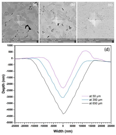 Indentation morphology of different depths from edge (a) 50 μm, (b) 350 μm, (c) 650 μm, and (d) indent profile of the FeCoCrNiMo HEA after sintering at 1150 °C and 30 MPa.