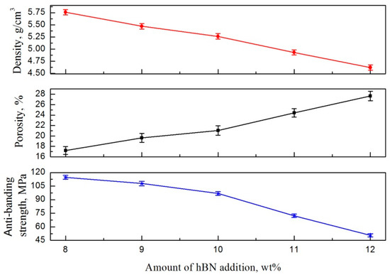 The effects of hBN contents on the density, porosity, and flexural strength of the NiCr/hBN self-lubricating composites are shown in Figure 1. The density of the NiCr/hBN composites showed an approximately linear decline with increased hBN content. The material porosity gradually increased with increased hBN content, and an inflection point appeared at 10% hBN. Thus, at this point, the rising amplitude of material porosity increased. Material flexural strength also gradually declined with increased hBN content, and an inflection point appeared at 10% hBN as well. This finding means that increased hBN content from 8% to 10% led to slowly decreased flexural strength of NiCr/hBN composites; conversely, increased content from 10% to 12% led to abruptly decreased flexural strength of the material.