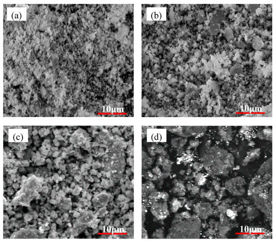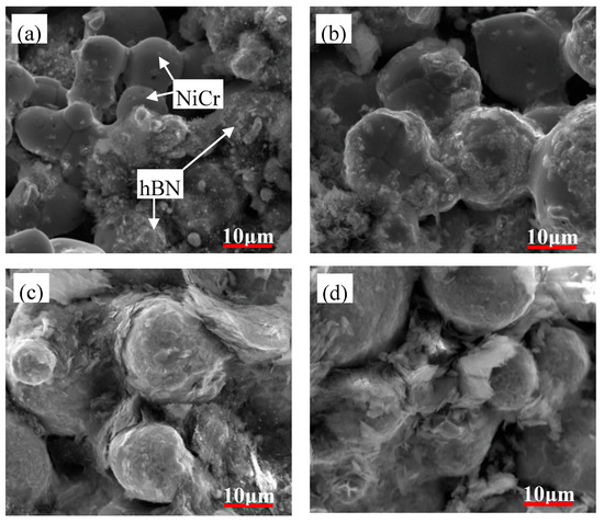 Figure 2 shows three-point flexural fracture appearance of NiCr/hBN composites with hBN contents of 8%, 9%, 10%, and 12%. Spherical NiCr alloy particles and pinnate hBN powders are observed. When the hBN content was 8%, an obvious sintering well formed between NiCr particles due to the diffusion and bonding during sintering, as shown in Figure 2a. However, when the hBN content was increased to 9% and 10%, the hBN powders dispersed among NiCr particles hindered the diffusion and bonding, as shown in Figure 2b,c. Considering the large difference between the densities of hBN (2.28 g/cm3) and NiCr alloy (8.47 g/cm3), the volume fraction of hBN increased by about 2.5% when its mass fraction increased by 1%, which resulted in increased quantity of hBN powders dispersed among NiCr particles. During preparation, hBN was dispersed between NiCr particles with favorable thermal stability and low sintering activity. It hindered the mutual diffusion among NiCr particles, and a greater hBN content corresponded to more obvious hindering effect, so the flexural strength of the composite gradually declined with increased hBN content. When the hBN content was 12%, its volume fraction exceeded 30%, so the sintering of NiCr particles was seriously hindered and no obvious sintering well formed on the material fracture, as shown in Figure 2d. Thus, the flexural strength of the material dropped sharply.