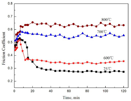 The change in friction coefficient of the NiCr/hBN composites containing 10% hBN with friction time at different temperatures is shown in Figure 3. At 25 and 600 °C, the material friction coefficient was high in the initial friction phase and declined to a steady level after about 20 min. The stable friction coefficient at room temperature w lower than that at 600 °C. At 700 and 800 °C, the material friction coefficient was low in the initial friction phase, taking about 10 min to reach the stable friction phase in the test; after the stable phase, the friction coefficient of the composite increased and became less stable than that at 25 and 600 °C. The stable friction coefficients of NiCr/10% hBN composites were about 0.28, 0.35, 0.56, and 0.63 at 25, 600, 700, and 800 °C, respectively.