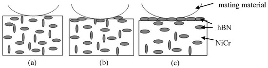 Figure 4. Schematic of the formation of solid lubricating film for NiCr/hBN composite: (a) pre-friction stage, (b) initial friction stage; and (c) stable friction stage.
