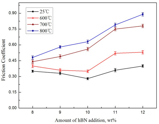 To investigate the friction and wear behavior of NiCr/hBN composite at high temperature, the friction coefficients and wear rates of the materials with different hBN contents at various friction temperatures were tested in this study. Figure 5 shows the change curves of the friction coefficient of NiCr/hBN composites with different hBN contents at different friction temperatures. When the friction temperature was room temperature and 600 °C, the friction coefficient initially decreased and then increased with increased hBN content and reached the minimum value at 10% hBN content. When the friction temperature was 700 and 800 °C, the friction coefficient increased with increased hBN content. When the hBN content was constant, the friction coefficients of the NiCr/hBN composites increased with increased friction temperature.