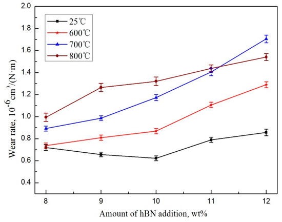 Figure 6 shows the change curves of NiCr/hBN composite with different hBN contents at different friction temperatures. At room temperature, the wear rate of NiCr/hBN composite initially decreased and then increased with increased hBN content, reaching the minimum value when the hBN content was 10%. At 600 °C, the wear rate of the NiCr/hBN composite initially increased gradually and then increased abruptly when the hBN content exceeded 10%, which indicates that the wear mechanism of the material changes when the hBN content exceeds 10%. At 700 °C, the wear rate of the NiCr/hBN composite linearly increased, but at 800 °C, the wear rate of the material abruptly increased with increased hBN content from 8% to 9%. When hBN content exceeded 9%, the wear rate increased slowly and remained unchanged.