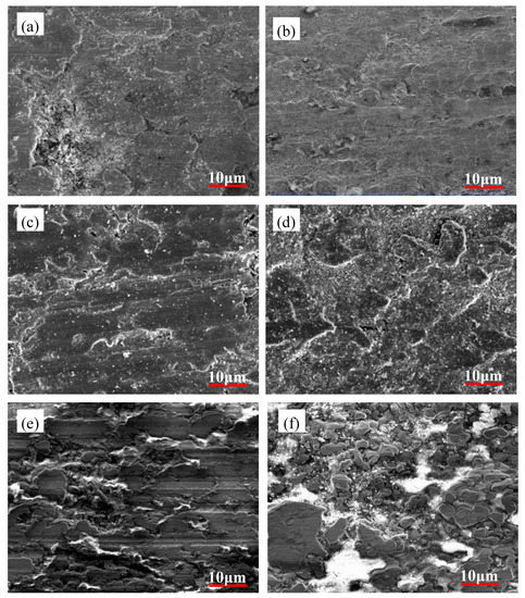 Figure 7. Wear-surface morphologies of the NiCr/hBN self-lubricating composites under different friction conditions: (a) 8% hBN, 25 °C; (b) 10% hBN, 25 °C; (c) 10% hBN, 600 °C; (d) 12% hBN, 600 °C; (e) 10% hBN, 800 °C; and (f) 12% hBN, 800 °C.