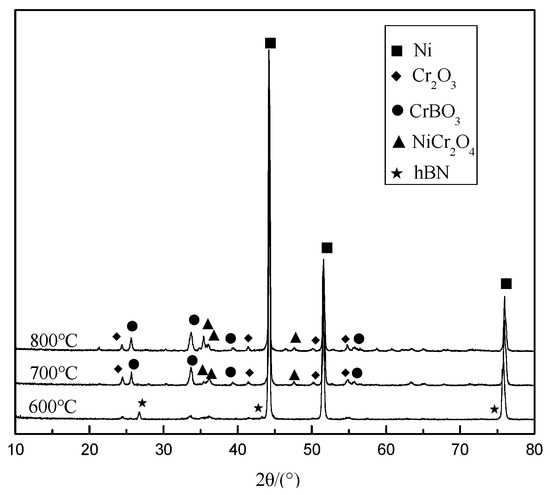 where μm is the friction coefficient between the metal matrix and mating material, and μe is the friction coefficient between the solid lubricating film and mating material. When n = 1, the friction surface reaches a complete solid-lubrication state and μ = μe; thus, the friction coefficient is equal to that of pure hBN (about 0.25) [10]. When n = 0, the friction surface is in a nonsolid lubrication state and μ = μm; thus, the friction coefficient is equal to the friction coefficient of pure NiCr matrix (about 0.46) [18]. Accordingly, if the Ni-Cr/hBN composite does not undergo oxidation, then the lubricating film consists of solid lubricant and metal matrix and its friction coefficient is between 0.25 and 0.46 (Figure 3) at room temperature and 600 °C. However, with increased friction temperature to 700 and 800 °C, the friction coefficient is much higher than that of NiCr matrix, indicating the presence of components with a high friction coefficient in the lubricating film.