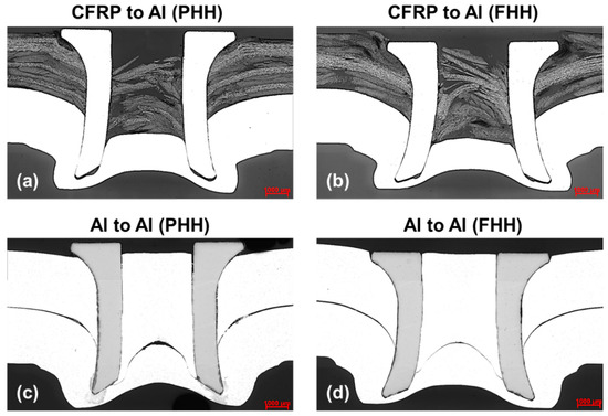 CFRP coupons with dimensions of 25 mm × 100 mm were cut from compression-molded plaques with dimensions of approximately 300 mm × 300 mm using a wet diamond saw. The CFRP plaques comprised a three-layer braided fabric (0°/±60°), and coupons were cut such that the axial fiber orientation was always transverse to the longest coupon dimension. The Young’s modulus of the CFRP laminate is approximately 60 and 30 GPa in the longitudinal and transverse directions, respectively. Aluminum coupons with dimensions of 25 mm × 100 mm were sheared from large blanks with the rolling direction parallel to the longest coupon dimension. All joints were created with the AA6111 in the T4 (un-aged) condition. A hollow tubular-style rivet as shown in Figure 1b was installed at the locations specified on the respective samples using a servo-driven Henrob SPR gun (Henrob Corporation, New Hudson, MI, USA). The rivet insertion depth was controlled via adjustment of the punch velocity. The velocity was tuned in 5 mm/s increments to deliver the desired rivet head height (or flushness). Lap-shear riveted joints were produced with a flush rivet head height (FHH; no head protrusion) and a proud rivet head height (PHH) 0.30 mm above the surface in the mixed material and similar material stacks. Figure 2 shows the cross-section of representative lap-shear SPR joints in mixed material and similar material stacks produced under different rivet head heights. Figure 2a is CFRP to AA6111 (PHH), Figure 2b CFRP to AA6111 (FHH), Figure 2c AA6111 to AA6111 (PHH), and Figure 2d is AA6111 to AA6111 (FHH). The rivet head height of individual SPR joints were measured after insertion using a handheld digital indicator with a collar fixture, and the average values are presented in Table 1. After rivet installation, the joined samples were subjected to a heat treatment at 180 °C for 30 min to simulate an automotive paint shop process.