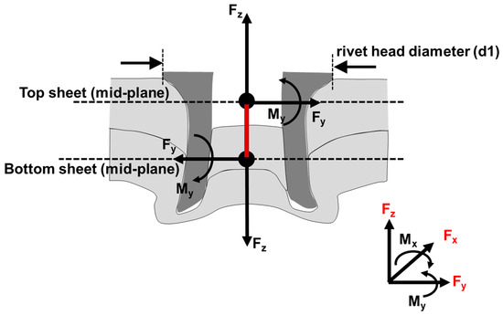 Cox and Hong simplified the Battelle structural stress method for spot welds and applied it for the SPR joints [24]. In this approach, the rivet is represented by a beam element which is assumed to have a circular cross section and a diameter equal to head diameter of the SPR. This beam element connects the sheets modeled as a coarse mesh of shell elements. The membrane and bending stress are calculated for the normal, transverse shear and in-plane shear components in the surrounding plate. Figure 4 shows the simplified rivet geometry used to calculate the structural stress using a rigid core model for plate structural stresses. By combining the maximum bearing stress in sheet with the maximum bending stress at the edge of the rivet, the maximum normal stress is determined as presented in Equation (1).
