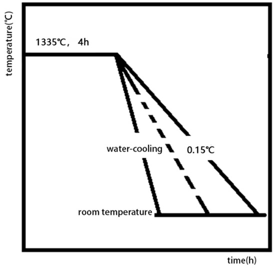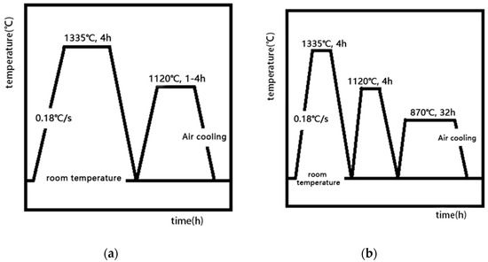 The solid solution treatment stage is divided into the heating process and the heat preservation process. The effects of temperature and holding time on the dissolution behaviors of materials have been studied in a large number of studies. In order to explore the influence of heating rate on the final precipitation morphology distribution during the heating process, the following experimental process was designed: a solution temperature of 20 °C higher than the standard solution temperature of heat treatment (i.e., 1335 °C) was taken as the solution temperature of the new heat treatment system. The samples were heated to 1335 °C at different heating rates, which were: ① rapid heating, ② 0.18 °C/s, and ③ 0.09 °C/s, respectively. The test process is shown in Figure 2.