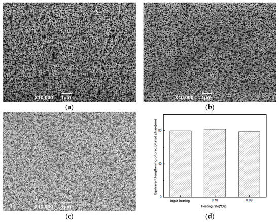 Three different heating rates were used to polish and corrode the specimens. The samples were heated from room temperature to the target temperature at different heating rates, and after full solution treatment, the temperature was reduced to room temperature at the same cooling rate. The microstructures of the precipitates were observed under high-power electron microscopy. The results are as follows: Figure 5. The average equivalent edge length of precipitated phase after cooling was 80 nm (Figure 5a), at rapid heating, 82 nm (Figure 5b) at the heating rate of 0.18 °C/s, and 79 nm (Figure 5c) at the heating rate of 0.09 °C/s. The average equivalent side lengths of the precipitated phases at different rates are shown in Figure 5c.