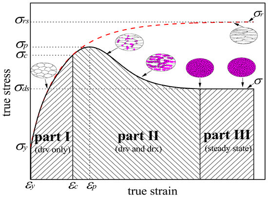 Schematic illustration of the microstructure evolvement and the division of the true stress-strain curve in the hot deformation process. According to the difference of the microstructure evolvement, the true stress-strain curve () is divided into three parts (part I, part II and part III). Part I undergoes the dynamic recovery (DRV) process. Part II is the initiation of the dynamic recrystallization (DRX) process while these un-recrystallized regions still undergo the DRV process. Part III is the steady state; all the original microstructure has been recrystallized and reaches a dynamic equilibrium in this part. The dashed curve ( ) represents the work-hardening behavior of part I and the un-recrystallized regions in part II.