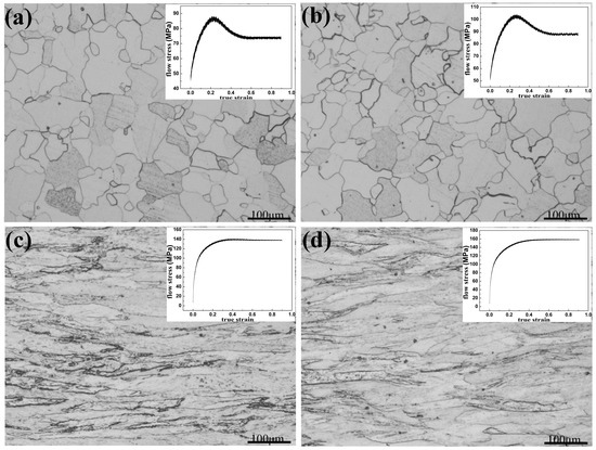 Shown in Figure 1, the dashed curve () is supposed to be the one that resulted only from the restoration process of DRV, i.e., in the absence of DRX. It represents the assumed strain-hardening behavior of part I and the un-recrystallized regions in part II. Although it cannot be directly obtained from experiments related to DRX, this curve can be derived from the strain-hardening behavior of part I. In the dashed curve, the saturation state is attained when the dislocation annihilation has increased sufficiently to balance the dislocation storage, and then the stress () reaches a steady value. As shown in Figure 2c,d, the typical true stress-strain curves only relating to DRV are presented with low deformation temperatures, and the grains corresponding to the saturation state of these curves are elongated along the deformation direction, which is the typical microstructure with only the DRV process.